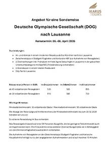 vom 6. bis 8. April 2026 plant die Deutsche Olympische Gesellschaft eine Fahrt nach Lausanne. Dort werden wir nicht nur das IOC und das Olympische Museum besuchen, sondern auch Gespräche über die deutsche Bewerbung um Olympische und Paralympische Spiele führen. Bei unserer letzten Reise konnten wir im IOC hierzu ein Gespräch mit dem damaligen IOC-Präsidenten Dr. Thomas Bach führen. Ein Besuch, der allen Beteiligten noch lange im Gedächtnis blieb. Die Reise wurde gemeinsam mit dem Reiseveranstalter Ikarus Tours geplant. Los geht es am 6. April 2026 gegen 8:00 Uhr in München mit einem Reisebus Richtung Lausanne. In Karlsruhe und Stuttgart nehmen wir Mitreisende auf.